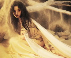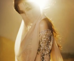 发型则采用简约低盘发,将长发整齐盘起,露出光洁的额头与优美的颈部线条,搭配少量碎发修饰脸型,既利落干练,又能凸显雾纱遮面的氛围感,避免了长发的拖沓,让整体造型更加清爽凌厉,与沙漠的苍茫调性完美融合。此外,造型没有搭配过多配饰,仅用简约的金属耳饰点缀,与鎏金纱裙呼应,遵循“少而精”的原则,避免了配饰堆砌的繁琐,进一步凸显了造型的高级感与氛围感。
