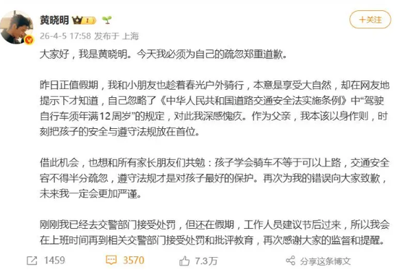 此次黄晓明的交通违法行为,并非严重的违法犯罪,却依然值得重视。交通法规的制定,是为了维护道路交通秩序,保障人民群众的生命财产安全,无论是谁,都应当严格遵守,公众人物更不例外。黄晓明主动现身认罚,不仅是对自身过错的正视,更是对交通法规的尊重,对公众安全的负责。他用自己的行为,向公众传递了“遵守交通法规,人人有责”的理念,也引导更多人重视交通安全,自觉规范自身出行行为。